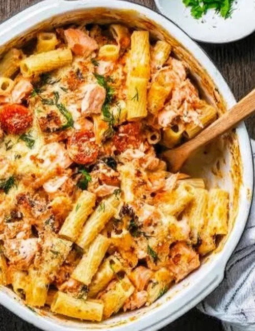 - Gently fold in the cooked pasta and salmon, ensuring it’s all nicely combined.