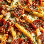 Baked Pizza Fries are a fun twist on the classic pizza experience with a cozy, comforting vibe. Imagine crispy fries topped with rich marinara sauce, gooey cheese, and savory pepperoni. They’re perfect for game nights, family movie marathons, or just a cozy weekend treat.