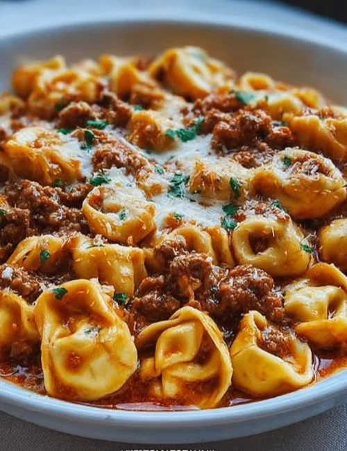 - Combine cooked tortellini with the meat mixture until well-coated.