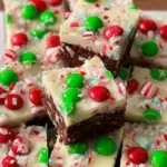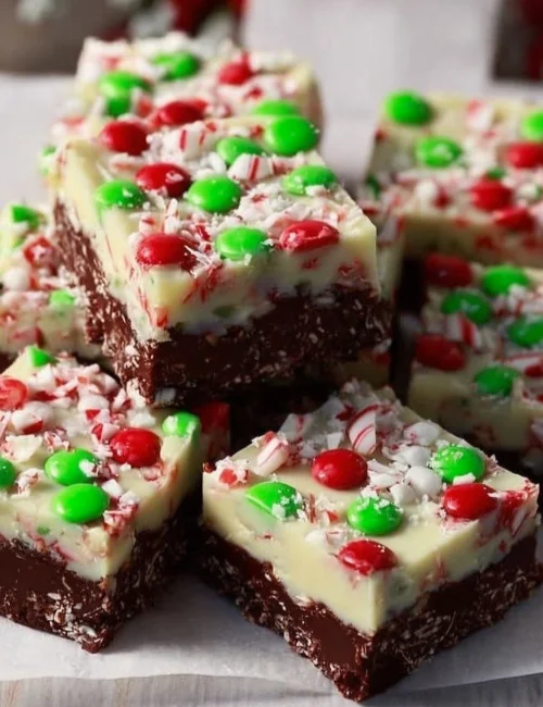 - Pour the melted white chocolate mixture evenly over the chocolate biscuit base. Immediately sprinkle crushed candy canes and Christmas M&Ms evenly on top for a festive look.