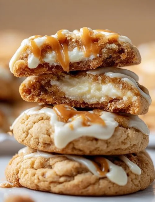 These cookies are a real treat. Soft and chewy, they have a delightful surprise inside. When you bite in, you’ll discover a rich cheesecake filling. Topped with a drizzle of caramel and a sprinkle of flaky sea salt, these cookies are perfect for any occasion. They’re great for dessert or a sweet snack with your afternoon coffee.