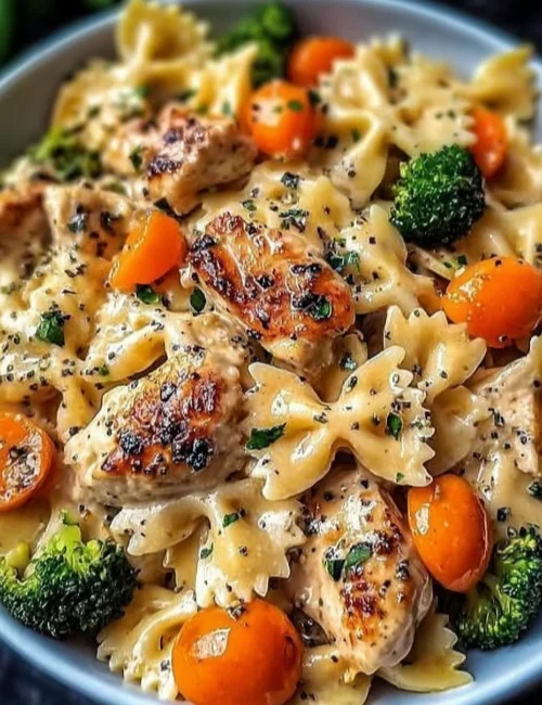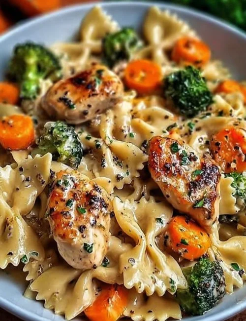 Making this creamy pasta is quite simple. You start by cooking the bowtie pasta and roasting the veggies. Then, you’ll prepare the chicken in a skillet before making the creamy cheese sauce. Everything comes together beautifully for a meal that’s both hearty and comforting.