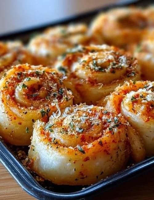Start by rolling out your pizza dough into a large rectangle. Aim for about 12×16 inches to ensure you have enough space to layer your toppings. Next, evenly spread the marinara sauce over the rolled-out dough. Make sure to leave a small border around the edges to prevent any messy spills during baking. Generously sprinkle shredded mozzarella cheese over the marinara sauce, followed by half of the grated Parmesan. Carefully roll the dough into a tight log, starting from one of the longer sides. Once rolled, slice it into even pieces, roughly 1-inch thick. Place the sliced rolls into a greased baking dish, arranged snugly but not overly crowded. In a bowl, mix melted butter, minced garlic, Italian seasoning, and the remaining Parmesan cheese. Brush this mixture generously over each roll. Preheat your oven to 375°F (190°C) and bake the rolls for 20-25 minutes, or until they turn golden brown and the cheese is bubbly. Remove the rolls from the oven, garnish with fresh parsley, and serve warm. Enjoy the cheesy, garlicky goodness!