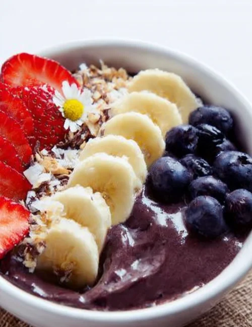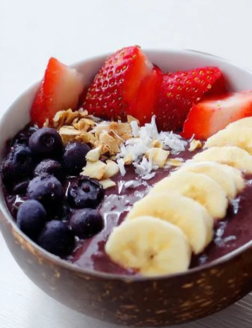 - Top the bowl with fresh banana slices, strawberries, blueberries, granola, chia seeds, and shredded coconut.