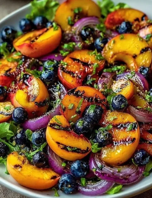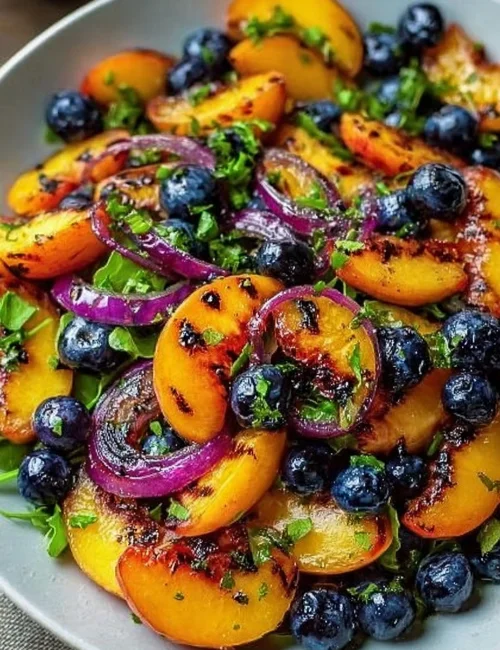 Grilled Peach Blueberry Salad is a delightful mix of flavors and textures. The sweet, juicy peaches and plump blueberries make for a refreshing dish that’s perfect for summer gatherings. This salad is easy to prepare and offers a wonderful combination of creamy cheese and crunchy pecans. It’s great as a light lunch or a side dish at a backyard barbecue.