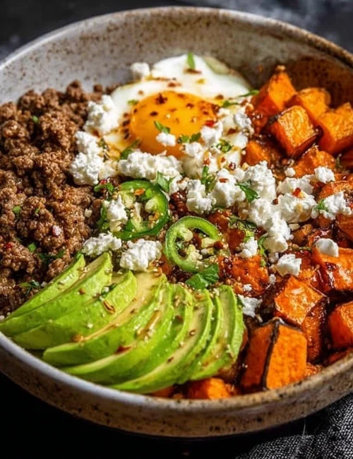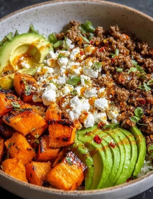 Ground Beef Hot Honey Bowl is a delightful meal that combines the savory flavors of seasoned beef with the natural sweetness of roasted sweet potatoes. It’s topped off with creamy cottage cheese and ripe avocado, and finished with a drizzle of spicy hot honey. This dish is perfect for busy weeknights or cozy family dinners.