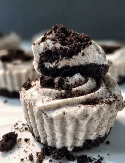 - Evenly scoop the cream cheese mixture into each liner and top with crushed Oreos, if desired.