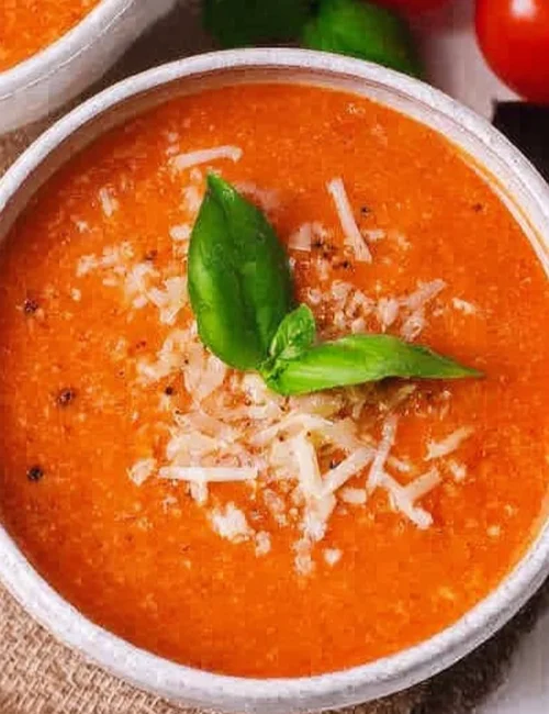 - Serve the soup warm, garnished with parmesan, basil, and pepper if desired.