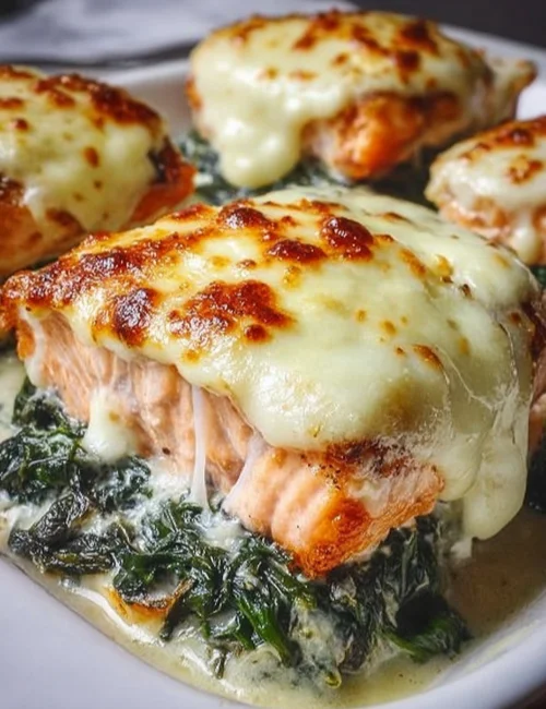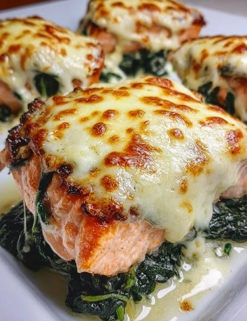 A wholesome baked salmon dish featuring rich mozzarella and fresh spinach, perfect for busy weeknights or cozy family dinners.
