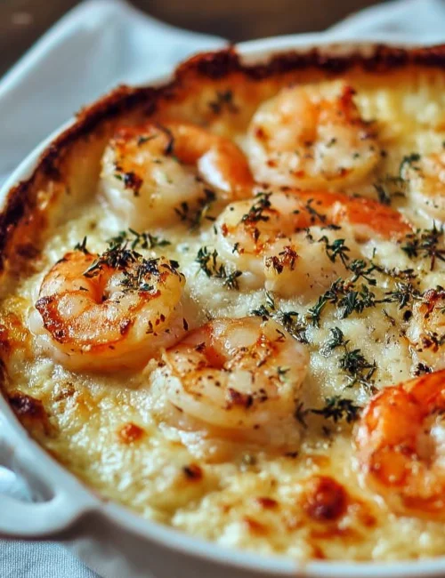 - Assemble Dish: Place shrimp in the prepared baking dish. Pour the cream sauce evenly over the shrimp.