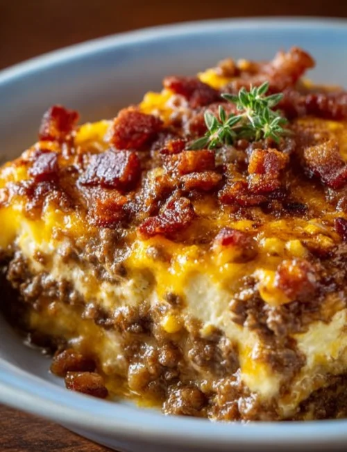 Cooking this casserole is straightforward. You’ll start by cooking the bacon and browning the beef with some onions and garlic. Then, you’ll mix in creamy ingredients and layer everything in a baking dish. After a quick bake in the oven, you’re ready to dig in!
