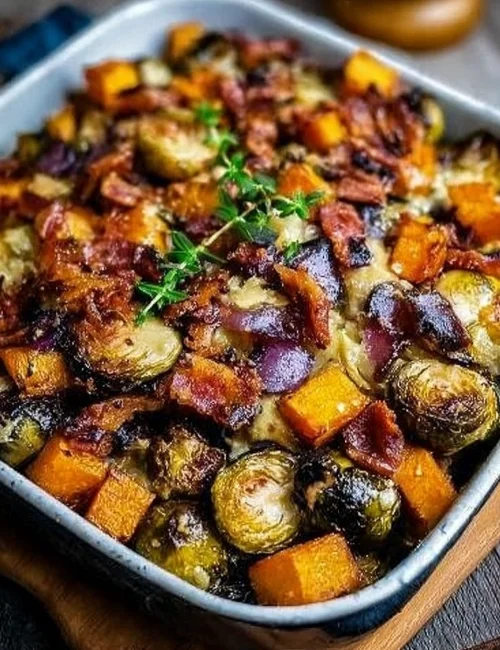 A cozy and flavorful dish featuring crunchy Brussels sprouts, creamy butternut squash, and crispy bacon, all sweetened with maple syrup. Perfect for family dinners or gatherings.