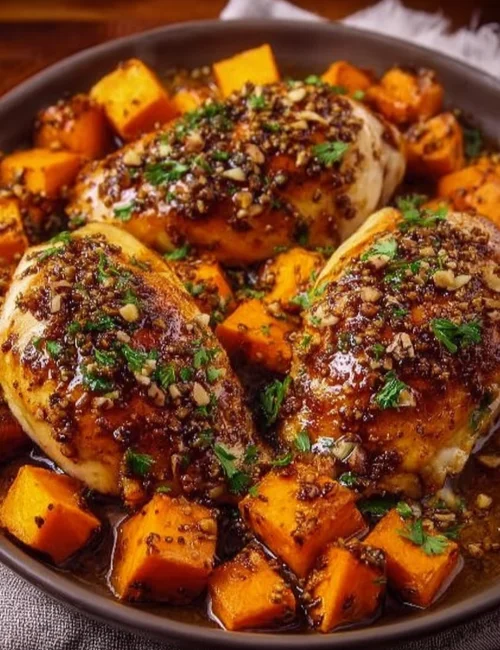 - Transfer the chicken and sweet potatoes to a serving platter. Garnish with freshly chopped parsley before serving.