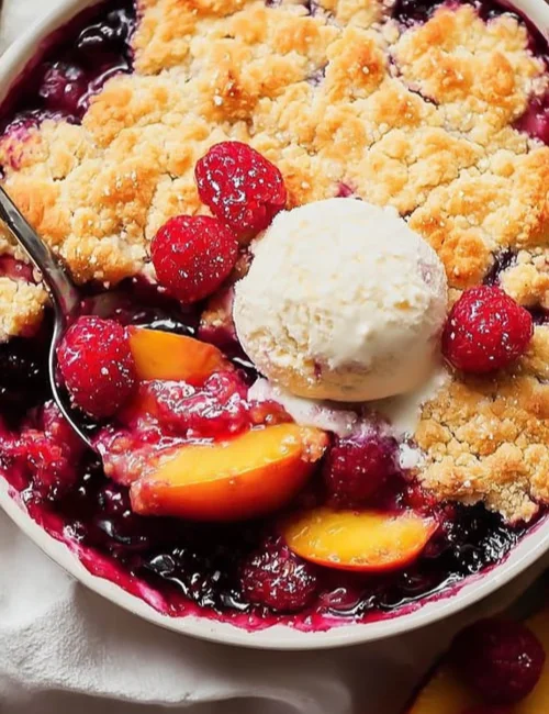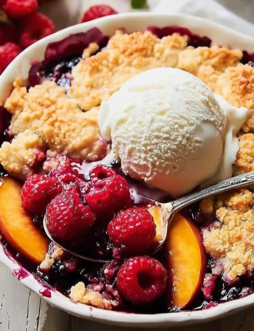 Peach cobbler with raspberries is a delightful dessert that brings cozy vibes to any gathering. The combination of sweet peaches and tart raspberries creates a lovely balance. It’s simple to make and perfect for warm evenings or family dinners. Serve it warm, and don’t forget a scoop of vanilla ice cream on top!