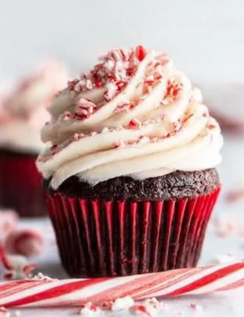 • For the buttercream, beat the butter until creamy, then gradually add in the powdered sugar, heavy cream, and extracts. Frost the cooled cupcakes and sprinkle with crushed candy canes if desired.