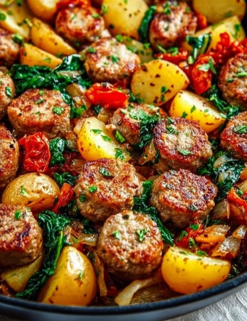 - Return the sausage to the skillet and toss everything together. If using spinach, stir it in during the last 2 minutes of cooking to wilt.