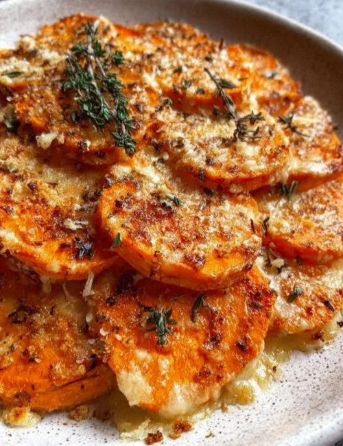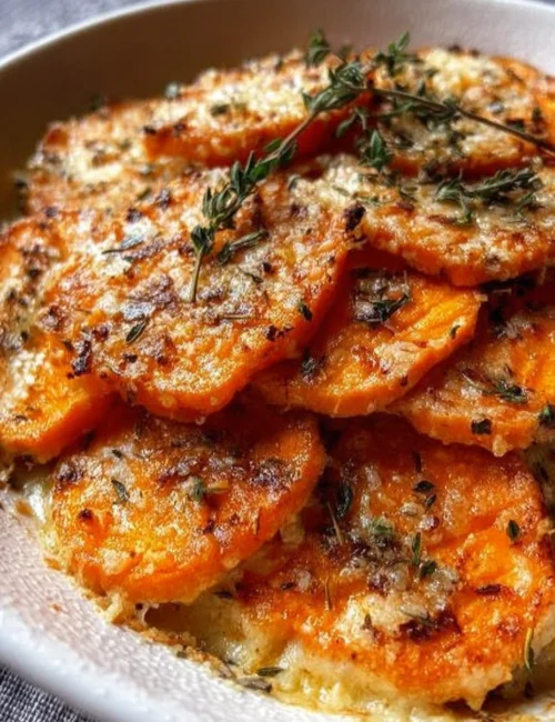- Repeat the layers with the remaining sweet potatoes, cheese sauce, and thyme.