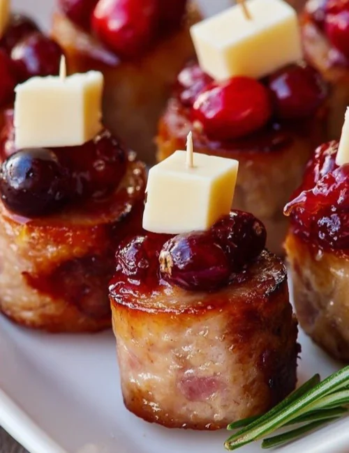 - Assemble the Bites: On a sheet pan, arrange the sausage, spoonfuls of cranberry sauce, and cheddar cheese cubes.