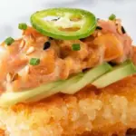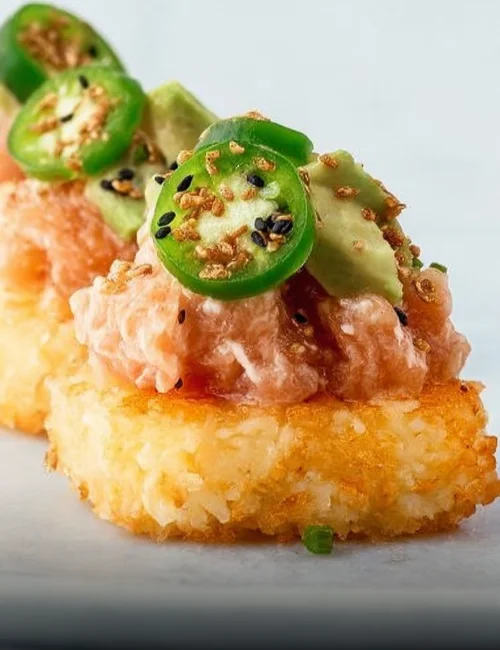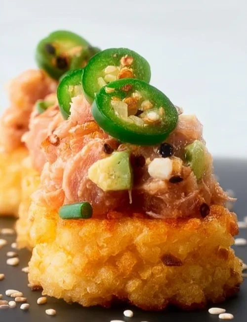 - Top each crispy rice rectangle with a dollop of spicy tuna, a slice of avocado, and finish with a slice of jalapeño for extra heat.