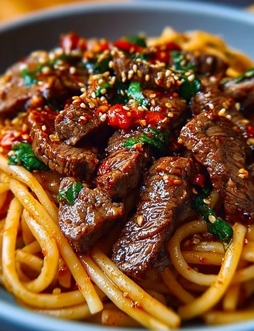 Making this pasta dish is straightforward and doesn’t require any fancy cooking skills. You’ll start by cooking the pasta and searing the steak in a skillet. Then, a quick sauce comes together, adding a sweet and spicy kick. Toss everything together, and you’ll have a delicious meal ready in no time!