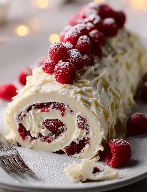 - Decoration: Spread whipped cream or white chocolate ganache over the roll. Decorate with fresh raspberries, white chocolate curls or shavings, and dust with powdered sugar for a “snow-dusted” effect.
