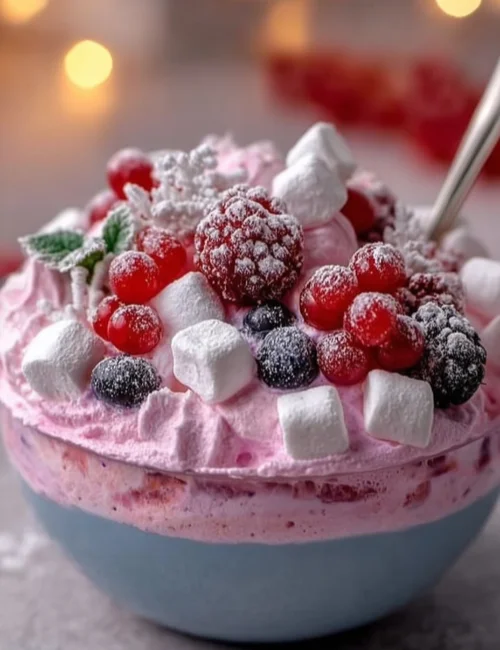 - Transfer the fluff to a festive serving bowl. Garnish with fresh mint leaves, additional berries, and a light dusting of powdered sugar for a snowy effect.
