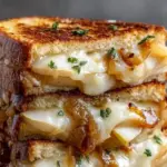 A delightful twist on the classic grilled cheese sandwich featuring sweet pear and apple, paired with rich caramelized onions and melted cheddar cheese.